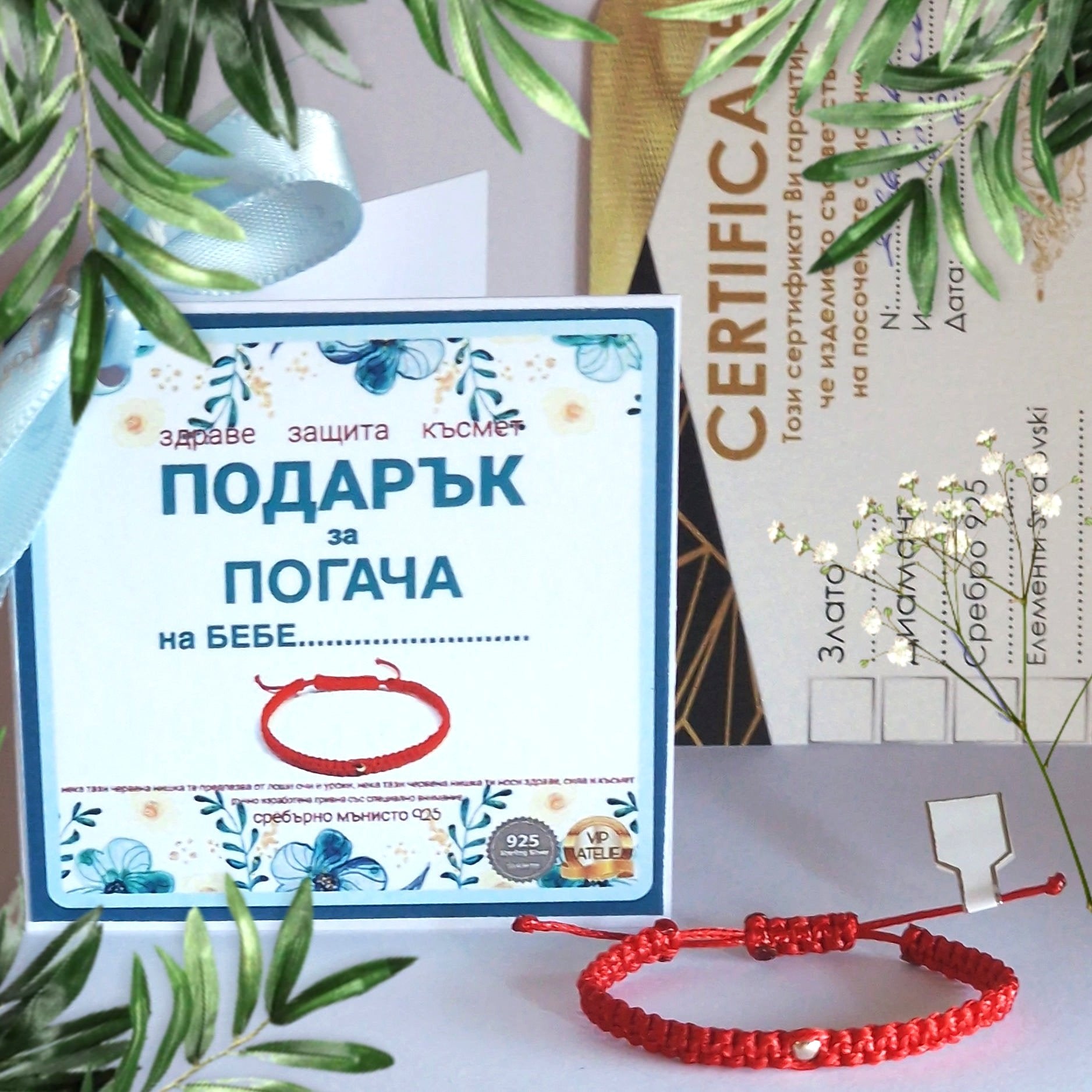 Подарък за погача на бебе момче червен конец против уроки със сребро 925, вплетено мънисто и картичка. Какво се носи на питка за бебе на 40 дни? Представяме ви едно малко и луксозно бижу - гривна с червен конец и сребро, плетена с луксозна бижутерска нишка, подходяща за нежните бебешки ръчички. Гривна с червен конец за подарък за наричане за здраве и късмет, против уроки и лоши очи. Гривната получавате със сертификат в стилна опаковка и кутийка, готова за подарък. Ръчно изработена гривна с червен конец в нашето ателие с много любов и положителна енергия.