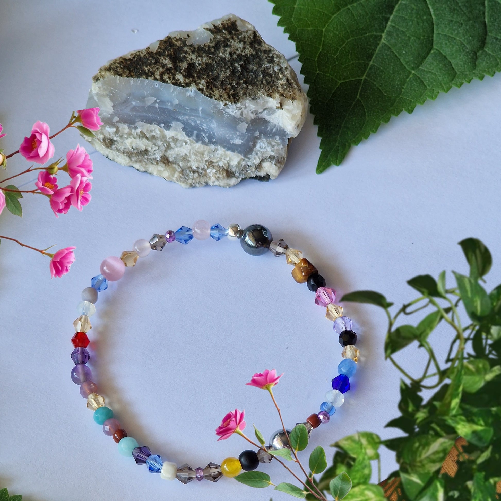 - 🌸 Тази гривна е изработена от фини, деликатни камъни и кристали, които нежно ще се докосват до твоята кожа. Те ще уловят и отразят твоя вътрешен блясък, превръщайки всяко движение в танц на светлина. Ще сияеш, обгърната в магията и красотата на кристалите, които ще нашепват своите енергийни послания само на теб.