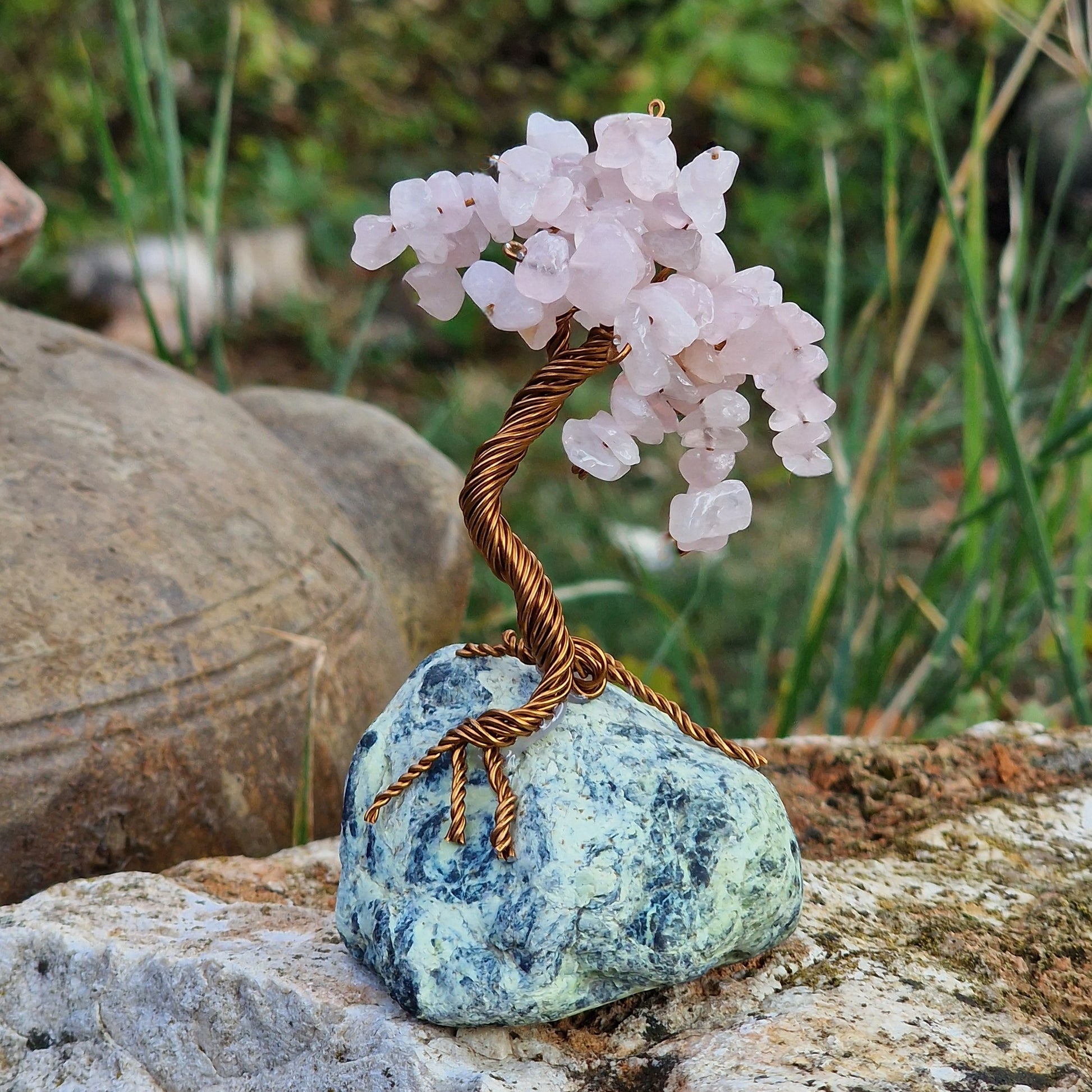 Дръвче от Естествени Камъни Розов Кварц Скулптура Уникален Подарък със Символика