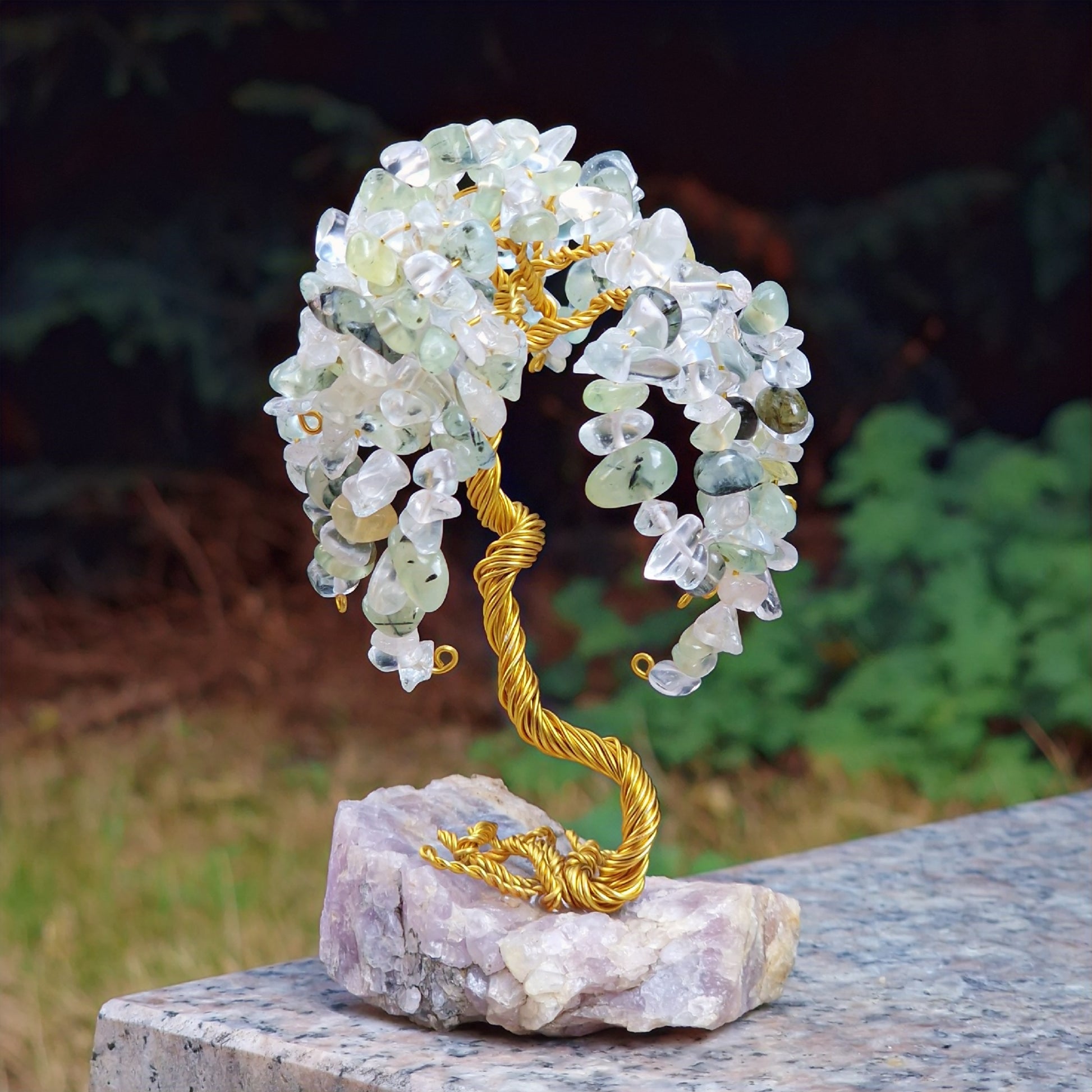 Дръвчето е изработено по авторска техника на дизайнерката с луксозна бижутерска тел и МИНЕРАЛ ЗА ОСНОВА ОТ РОДОПИТЕ.
