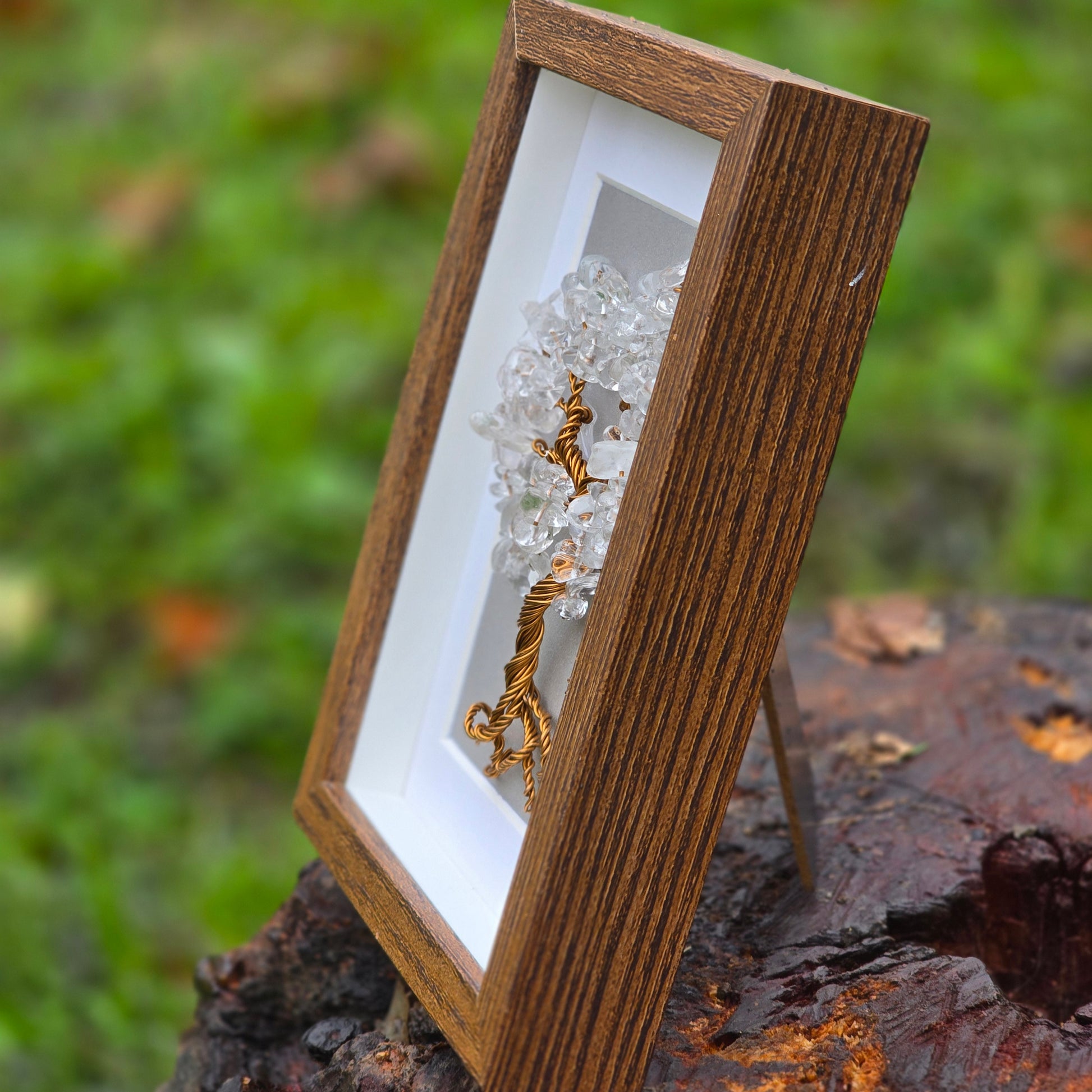 В това дръвче сме вложили естествени камъни Планински Кристал. Размери 10/15 см. и красива дървена рамка.