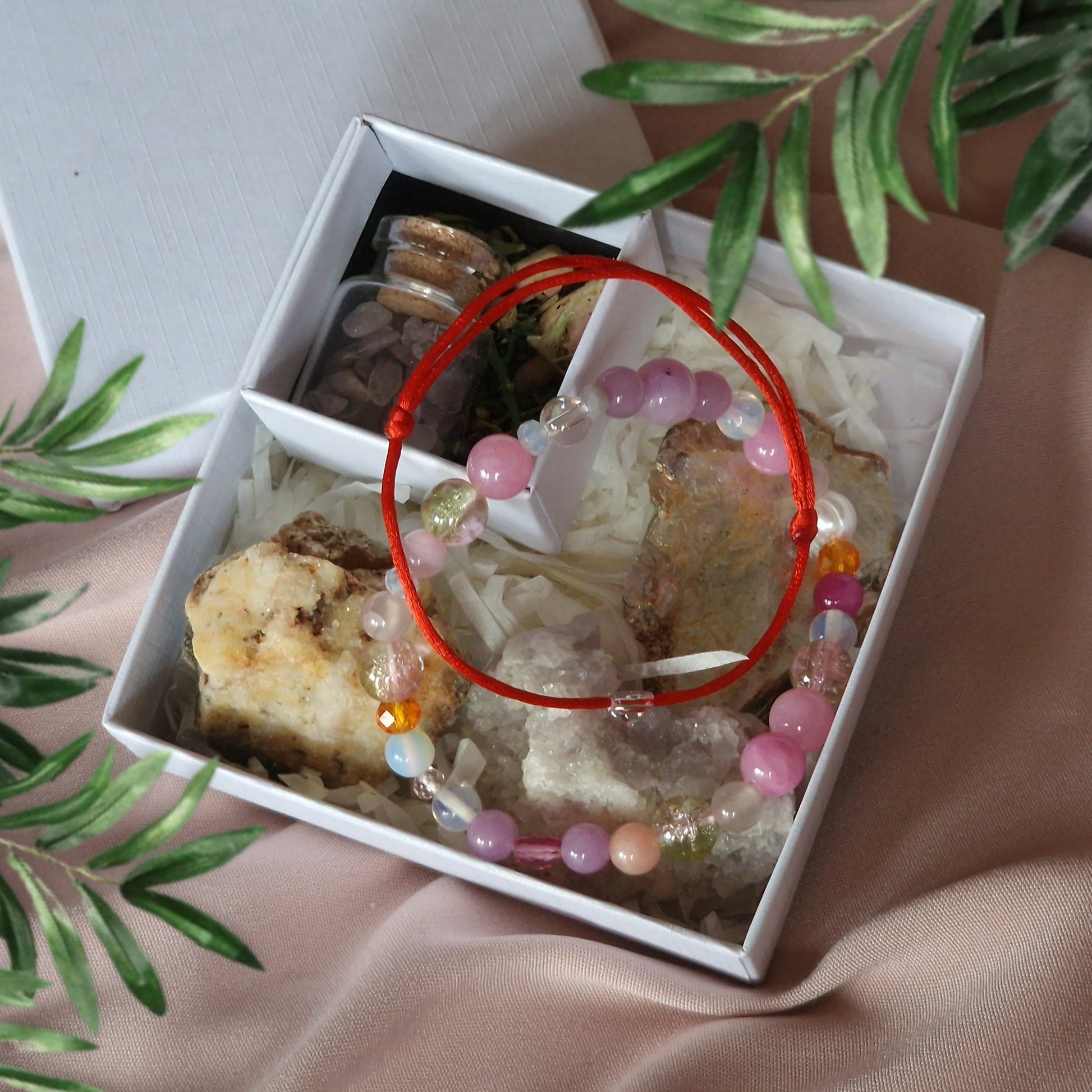 Вашият ритуал за привличане на късмет и положителна енергия, изобилие и богатство във всички аспекти. Представяме ви кутия с минерали от Родопите и две уникални гривни от естествени камъни и кристали. В кутията има минерали от Родопите и стъклено шишенце с естествени камъни - амулет за защита.