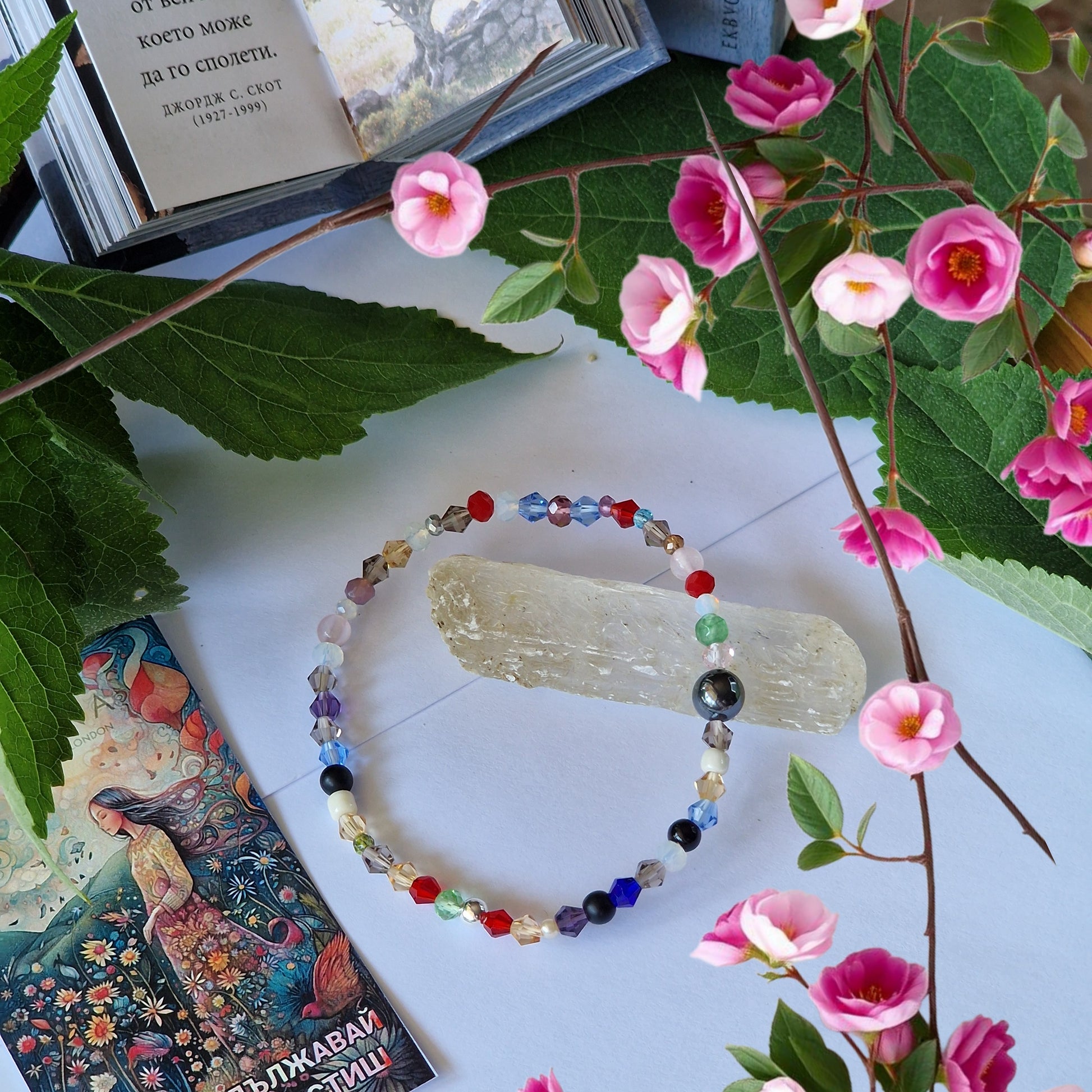 • 🌸 Тази гривна е изработена от фини, деликатни камъни и кристали, които нежно ще се докосват до твоята кожа. Те ще уловят и отразят твоя вътрешен блясък, превръщайки всяко движение в танц на светлина. Ще сияеш, обгърната в магията и красотата на кристалите, които ще нашепват своите енергийни послания само на теб.