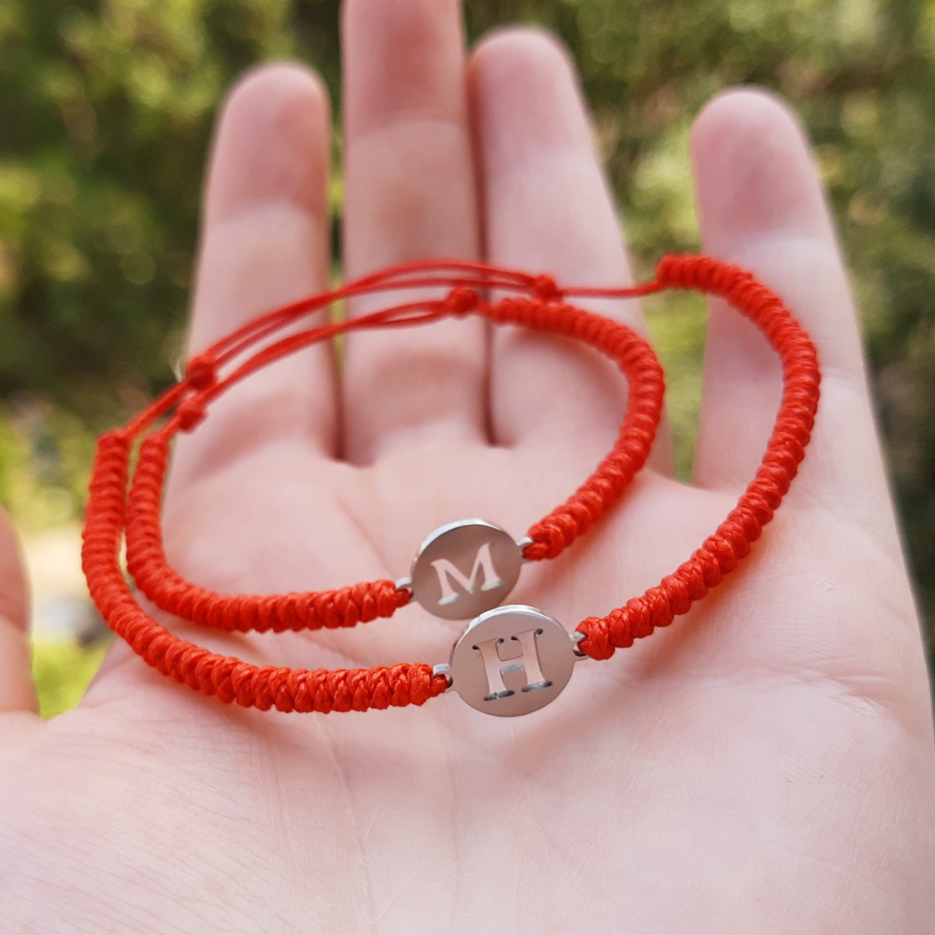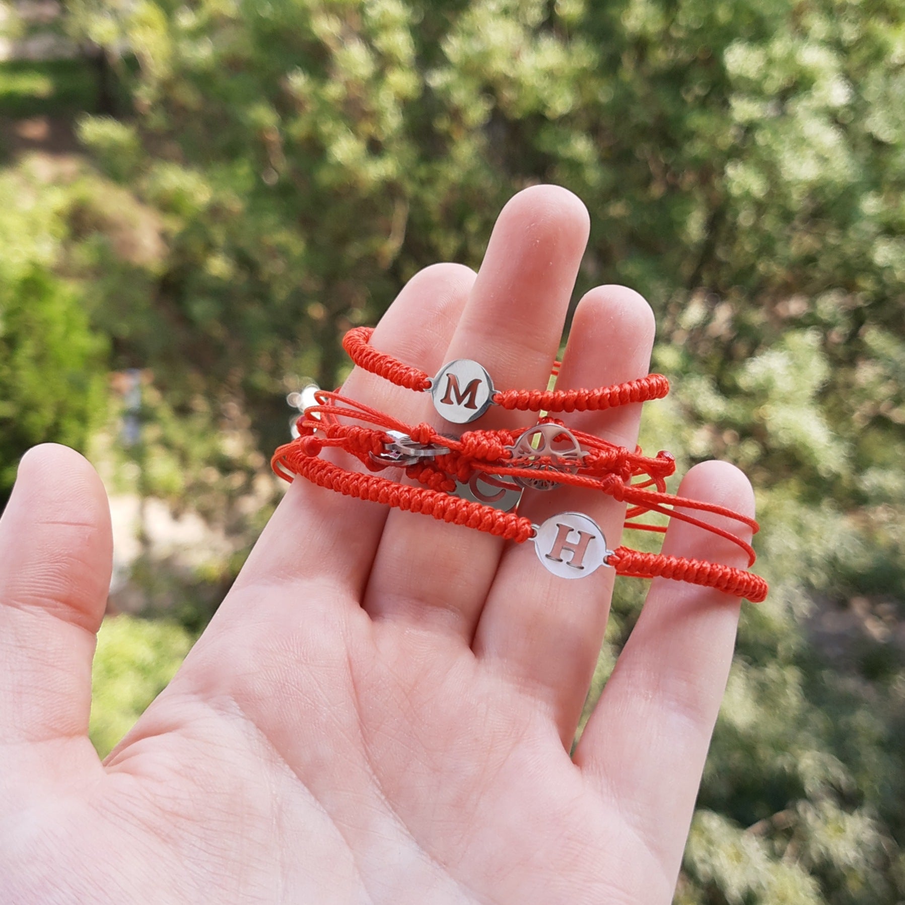 Нежни, деликатни два броя амулети гривни за късмет, защита и против уроки за мама и бебе. Изработени от нежна но здрава червена бижутерска нишка конец Dellena Garvio със съдържание на копринени нишки и луксозна гравирана стоматена буква. Гривничките са деликатни и не пречат и не дразнят и най-нежната кожа. Плъзгащите възли лесно регулират размера.